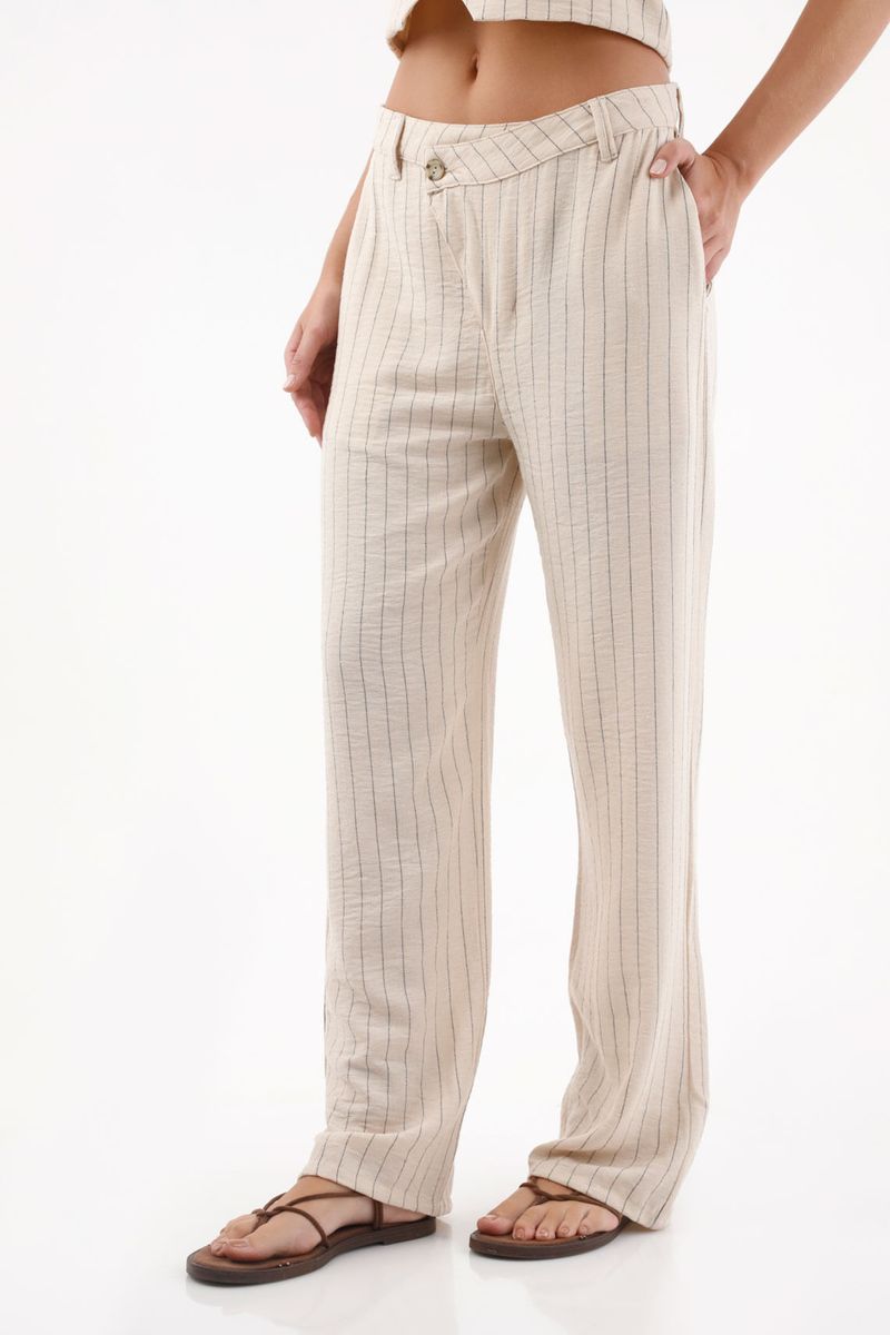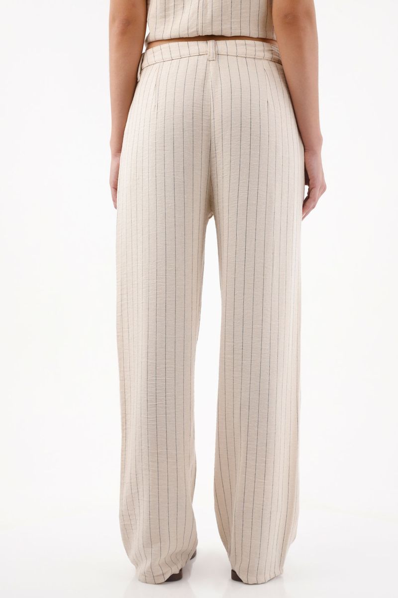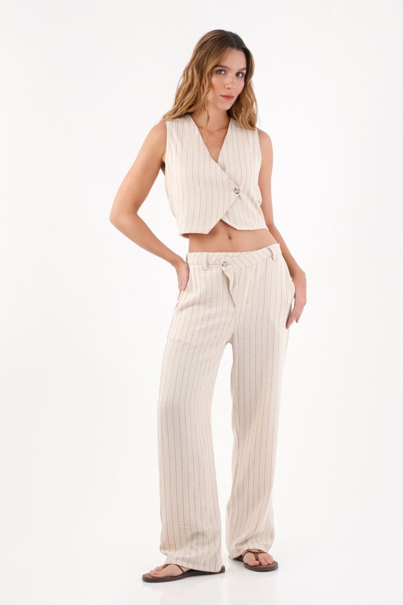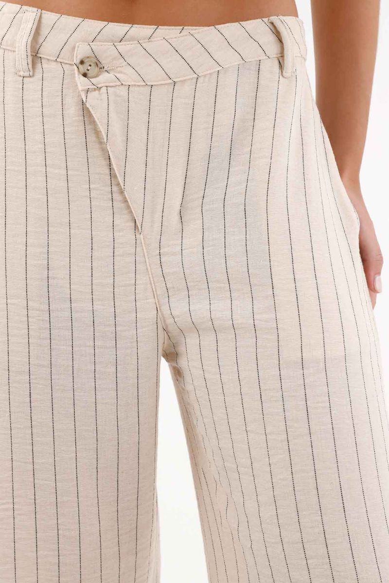 Este pantalón wide leg beige de TNS juega con pinstripes preteñidas para crear una línea larga y limpia. Confeccionado en tejido con viscosa, su textura sutil realza el look urbano. La pretina con cruce y botón visto suma un guiño sastrero, los bolsillos laterales aportan naturalidad y las presillas mantienen el talle ordenado. El tiro medio y la pierna ancha aportan una caída relajada que favorece distintas alturas.