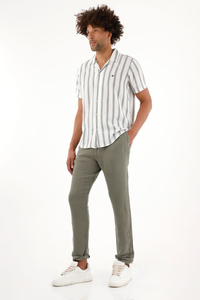 Con un corte slim y tejido ligero, esta silueta se convierte en un básico moderno, ideal para disfrutar de días cálidos.