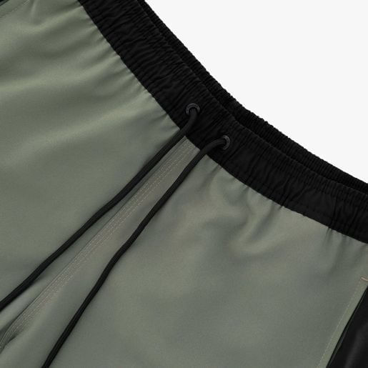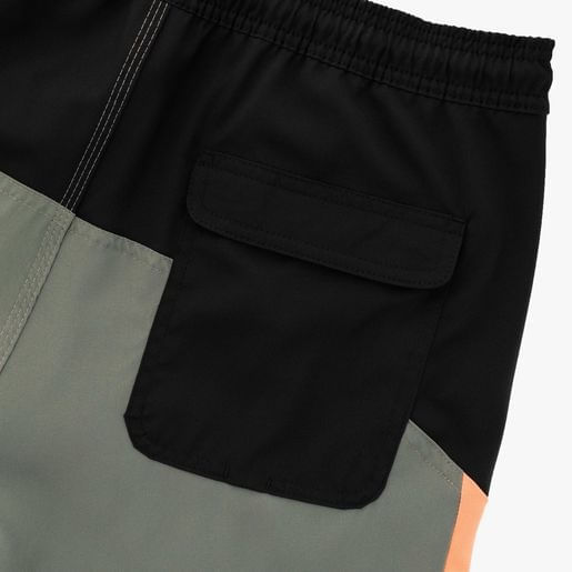 Bañador clásico de corte recto y corto, con diseño bicolor y Tejido sostenible elástico, repelente al agua y libre de PFC. Cintura fija con cordón, bolsillo trasero con solapa y cordón para llaves.