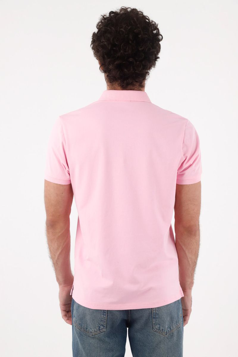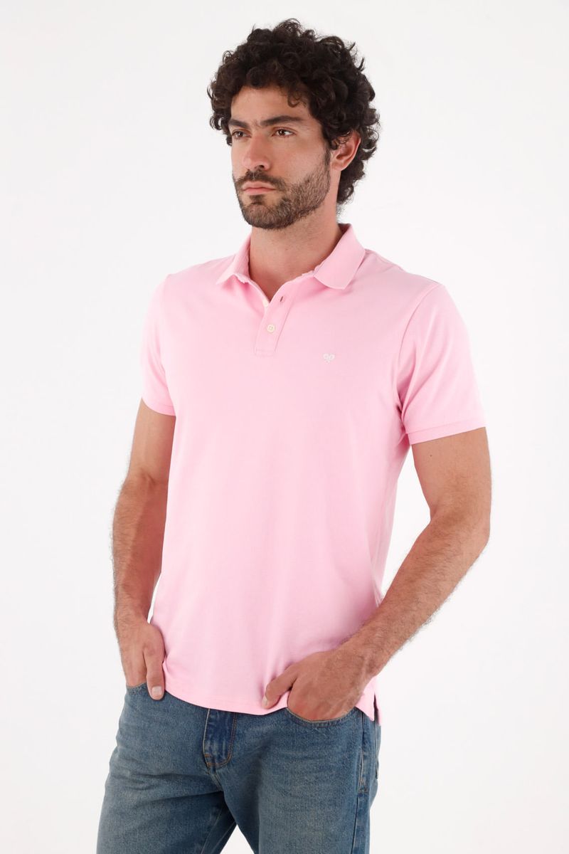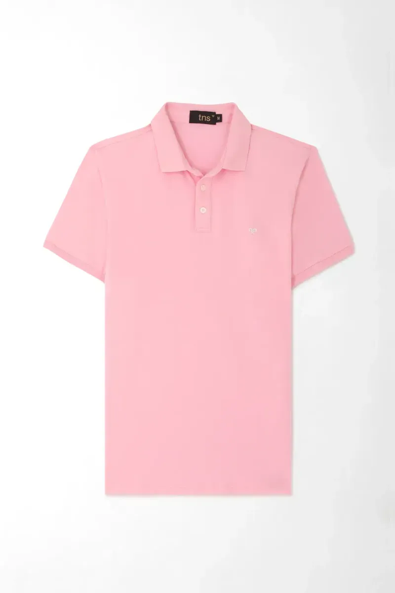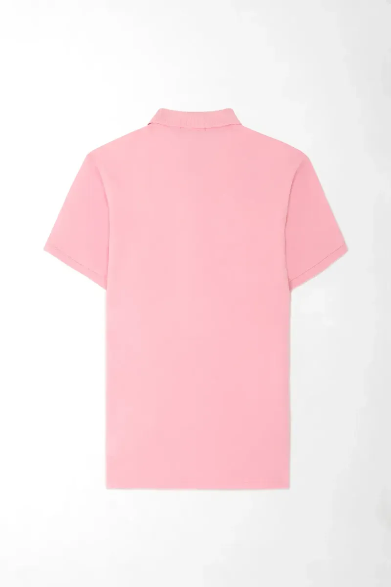 Rosa pastel que refresca lo básico. Un polo liso que cambia el mood del día: el color sólido aporta luz y un punto creativo sin esfuerzo. El cuello camisero con tapeta de dos botones mantiene el look pulido; las mangas cortas y el detalle mínimo en el pecho refuerzan ese aire limpio y versátil. El tejido de algodón con un toque de elastano acompaña tus movimientos, mientras el regular fit cae recto para verse moderno sin perder comodidad.