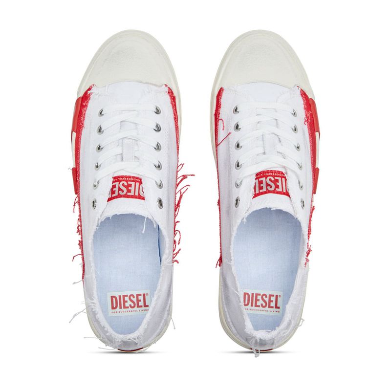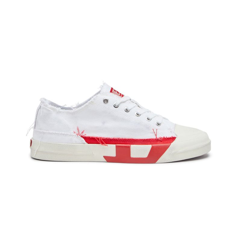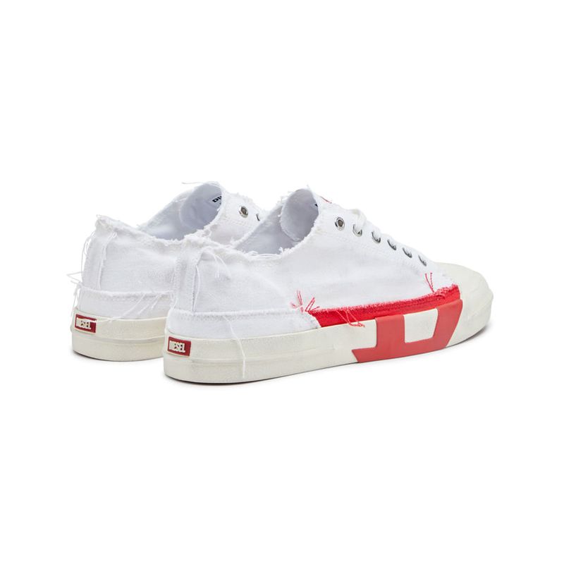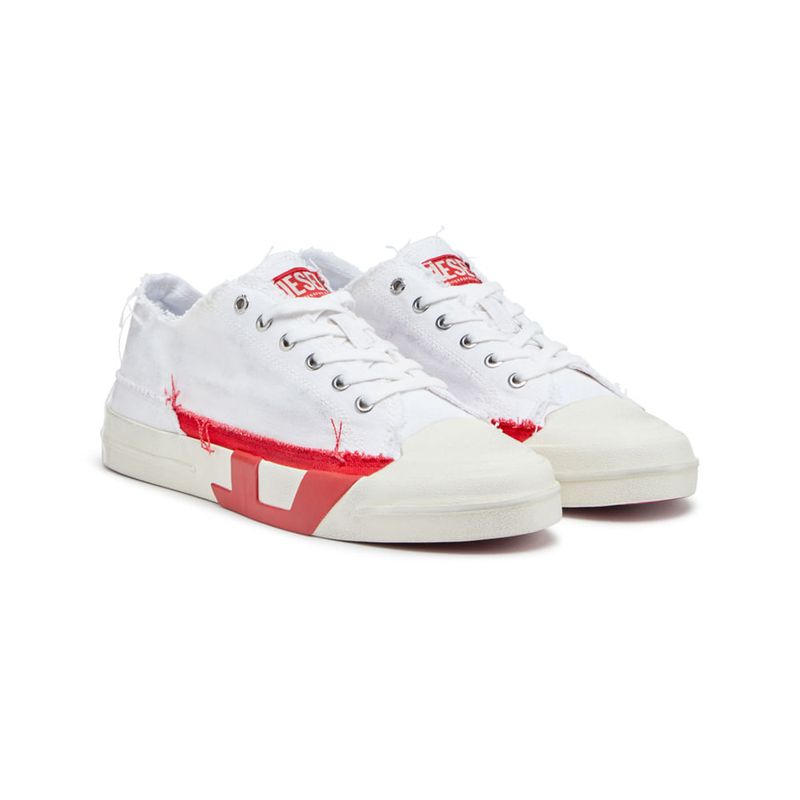 Hechas de lona, estas deportivas de hombre de corte bajo presentan una interpretación audaz del icónico logotipo D rojo de Diesel. El emblema, originalmente pequeño, se presenta en un diseño de tela y goma dual que está dividido entre la parte superior y la suela en proporciones aumentadas. Los zapatos están deshilachados y desgastados a mano con manchas de efecto sucio, dando la apariencia de años de uso.