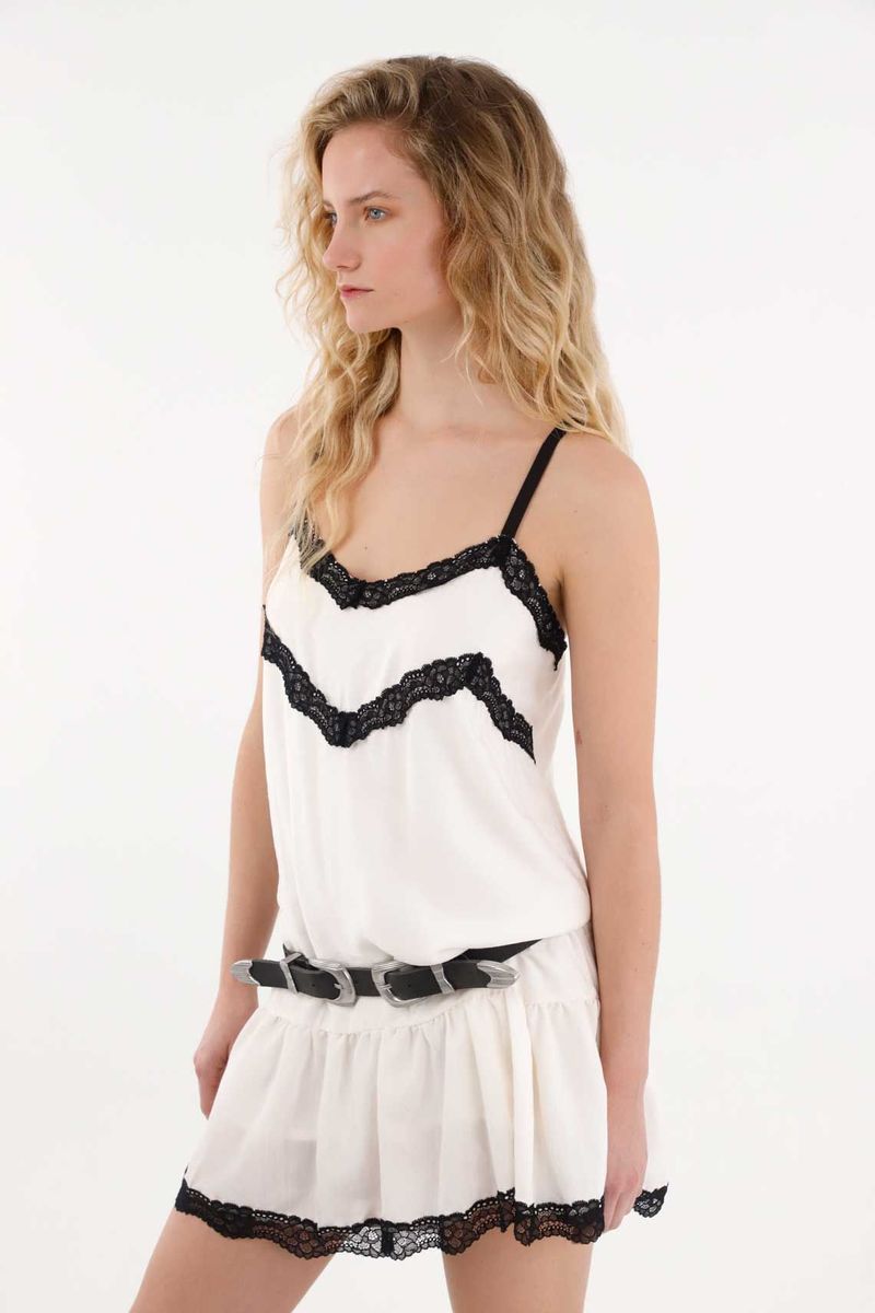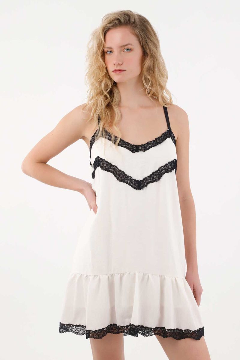 Este vestido corto está confeccionado en una tela liviana que cae con suavidad y fluidez, ideal para los días cálidos o para looks casuales con un toque romántico. Su escote en V estiliza y alarga la figura, mientras que las tiras graduables permiten un ajuste perfecto a tu medida. El bolero en el ruedo añade un movimiento encantador, y los detalles de encaje en contraste elevan la prenda con un acabado delicado.