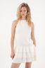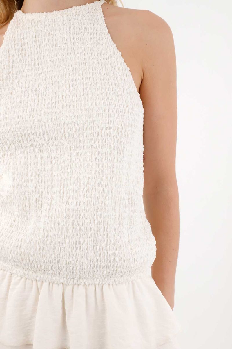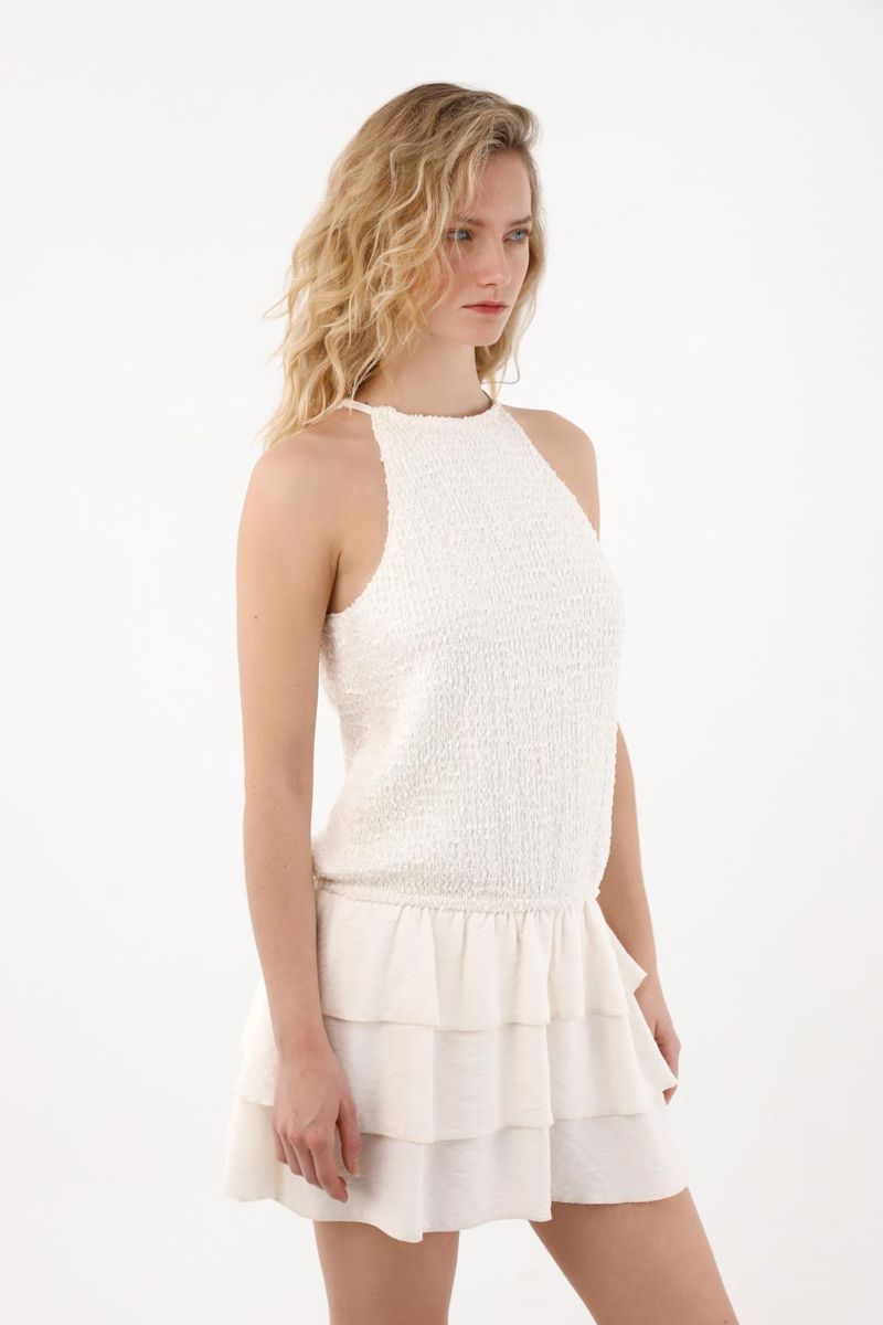Este vestido corto combina una parte superior con textura y una falda en tela liviana, creando un contraste visual que aporta interés y delicadeza. Su escote halter y cuello alto con abertura en espalda estilizan la figura y añaden un toque sofisticado, mientras que la manga sisa mantiene la prenda fresca y perfecta para días cálidos o eventos especiales. La falda con boleros aporta fluidez y un movimiento encantador que acompaña cada paso.