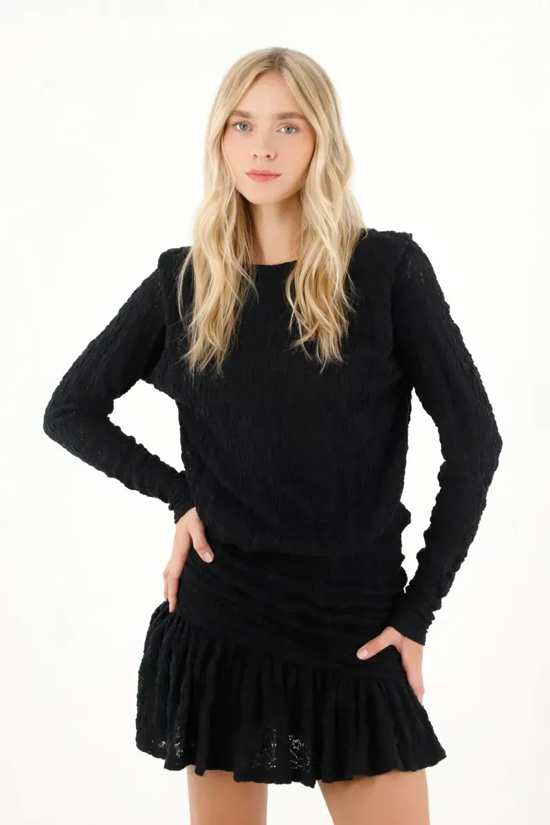 La blonda le da textura y un acabado delicado, mientras el fajón drapeado marca la silueta de manera favorecedora. El bolero en el ruedo suma movimiento y dinamismo, y las mangas largas equilibran el look con un contraste elegante. Perfecto para combinar con tacones minimal en un evento especial o con botas altas para un styling más arriesgado.