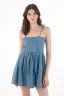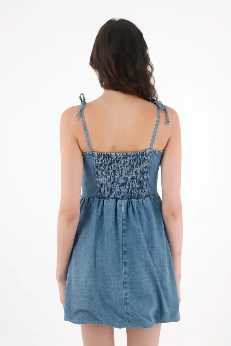 Este vestido corto en denim combina una estructura tipo corset en la parte superior con una falda globo que aporta volumen, movimiento y un aire fresco y divertido. Los cortes del corset ayudan a definir la figura sin perder comodidad, mientras que las tiras anudables en los hombros le dan un toque femenino y personalizable, permitiendo ajustar el largo y sumar un detalle visual encantador.